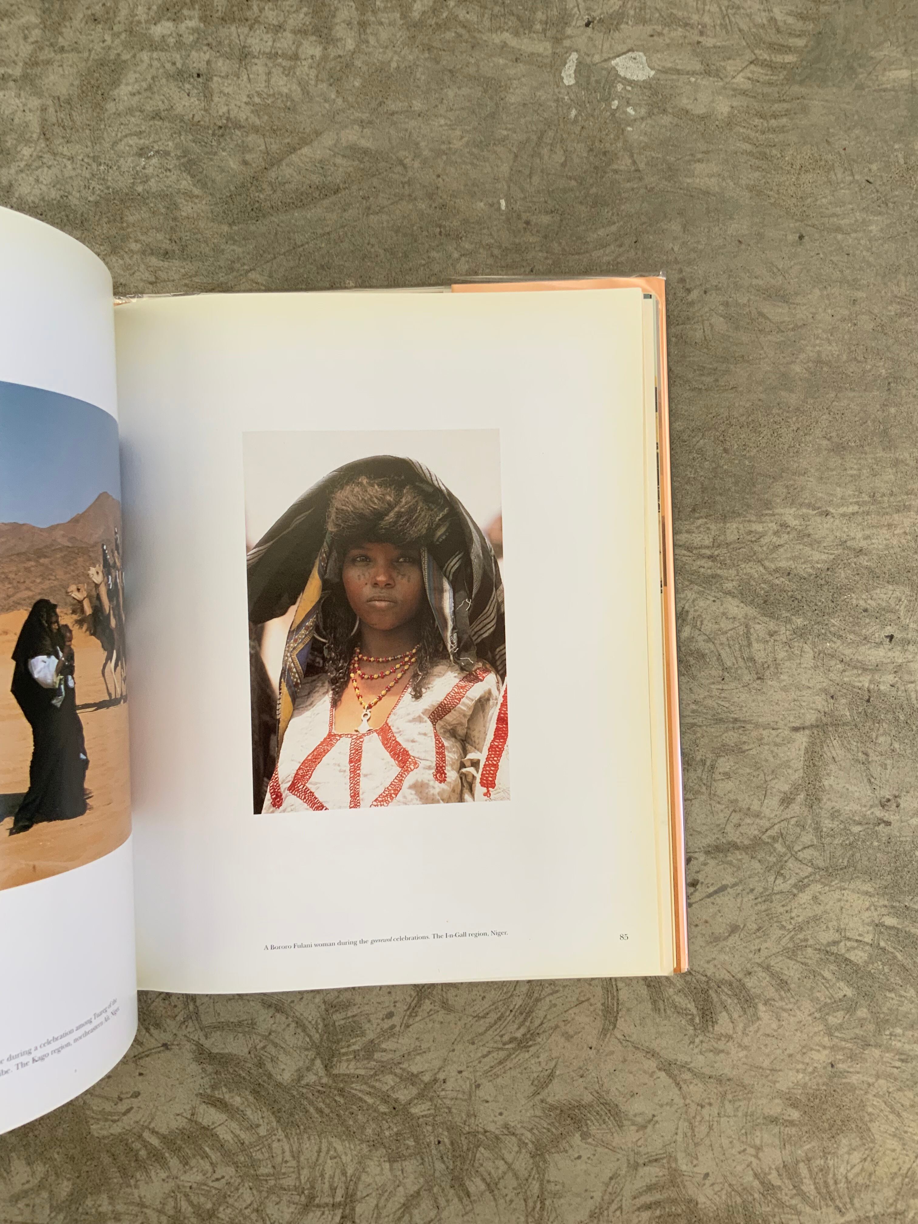 サハラ砂漠の壮大な山々やオアシスの風景、人々の写真がカラー写真でまとめられた1冊。